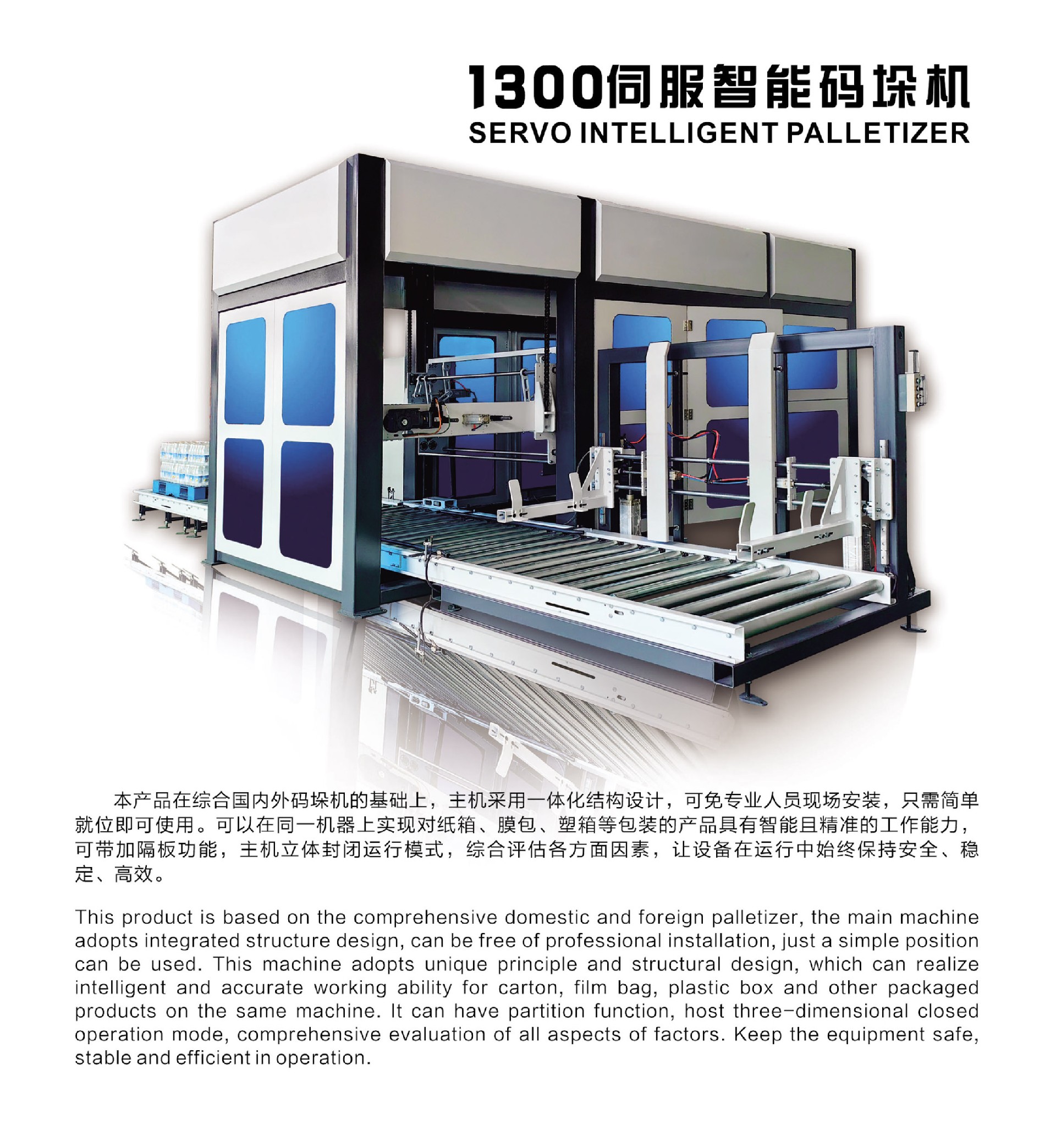 本设备主要是将已经装好产品的纸箱,按一定排列方式码在托盘上,进行自动推码,可堆码多层,便于又车运送至仓库存储。由PLC实现智能化操作,减少人工,提高速度。