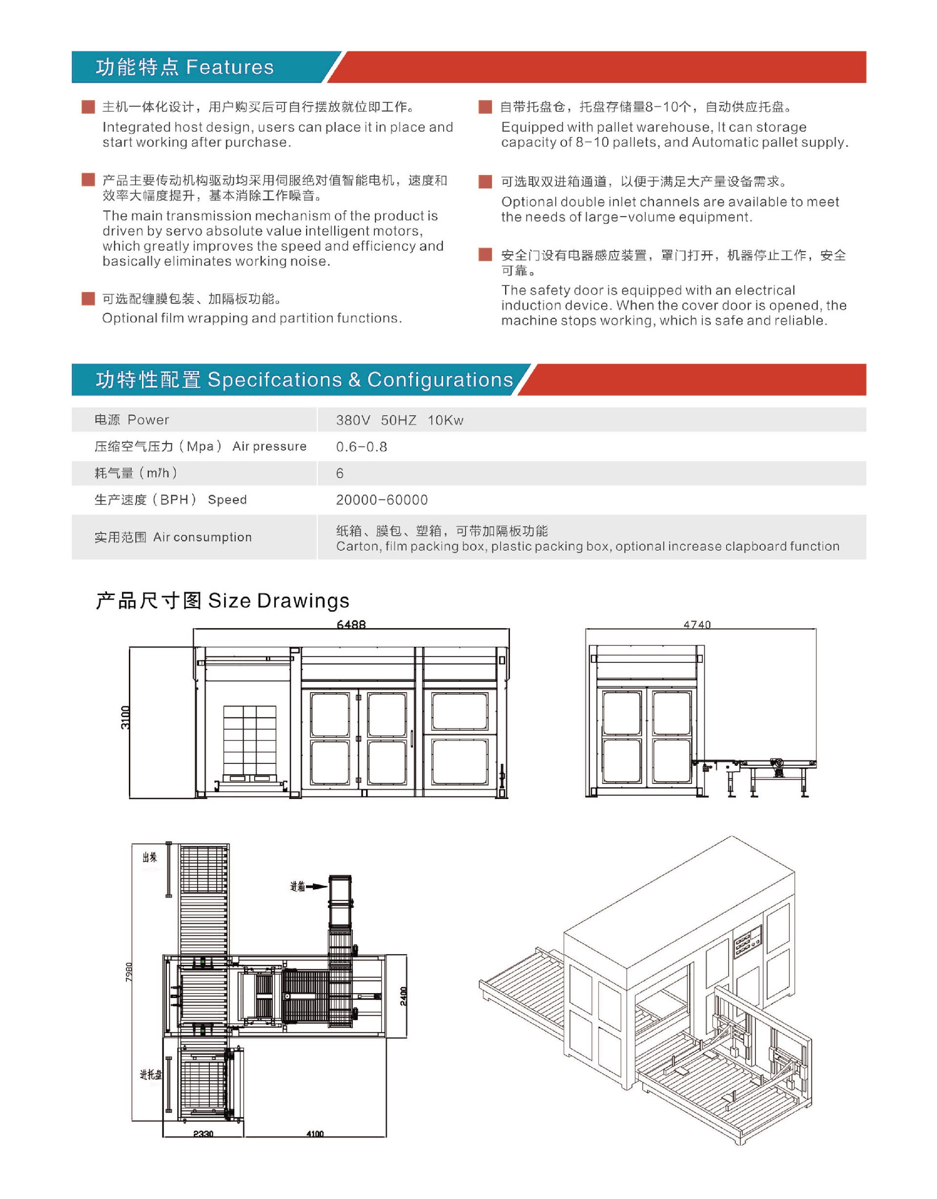 *采用触摸屏操作实现人机对话,可显示生产速度,故障原因及位置,自动化程度高。采用PLC可编程序对纸箱的排序堆垛层数、栈板供应及排出均可编入程序进行控制。